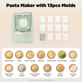 - Details the inclusion of 13 interchangeable molds for diverse pasta shapes.